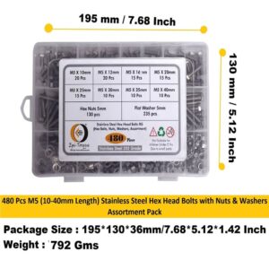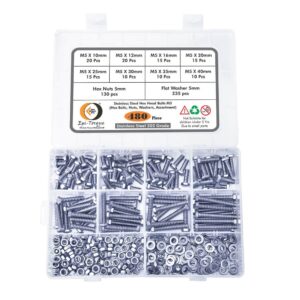 Epi-Torque Metric M5 Stainless Alloy Steel Full Threaded Hex Bolts, Nuts, and Washer Assortment Kit – 480 Pcs