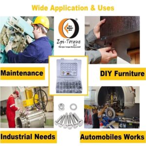 With the Epi-Torque Metric M3, M4, M5, M6 Stainless Alloy Steel Full Threaded Hex Bolts, Nuts, and Washer Assortment Kit, your work will be more efficient, and your results more reliable. This high-quality set is designed to meet the needs of any user looking for reliable, durable, and versatile hardware for their toolkit.