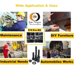 The Epi-Torque High-Tensile Allen Bolts Set (M3) contains 576 pieces of M3 Allen bolts in assorted lengths ranging from 6mm to 30mm. Manufactured with Hi-Tensile Steel (Grade DIN 7991 10.9), this set offers excellent strength and performance for all your fastening applications. Ideal for a wide range of uses, from automotive repairs to DIY projects.