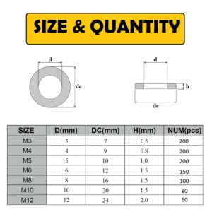 - Comprehensive Assortment of 7 Sizes: The kit includes a wide range of sizes: M3, M4, M5, M6, M8, M10, and M12 (990 pieces total). This variety ensures you have the perfect washer for multiple applications, whether you’re working on small household projects or larger industrial tasks.