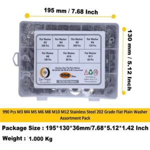 Stainless Steel Alloy Flat Fender Washers Assortment Kit (990 Pcs) – 7 Sizes (M3, M4, M5, M6, M8, M10, M12)